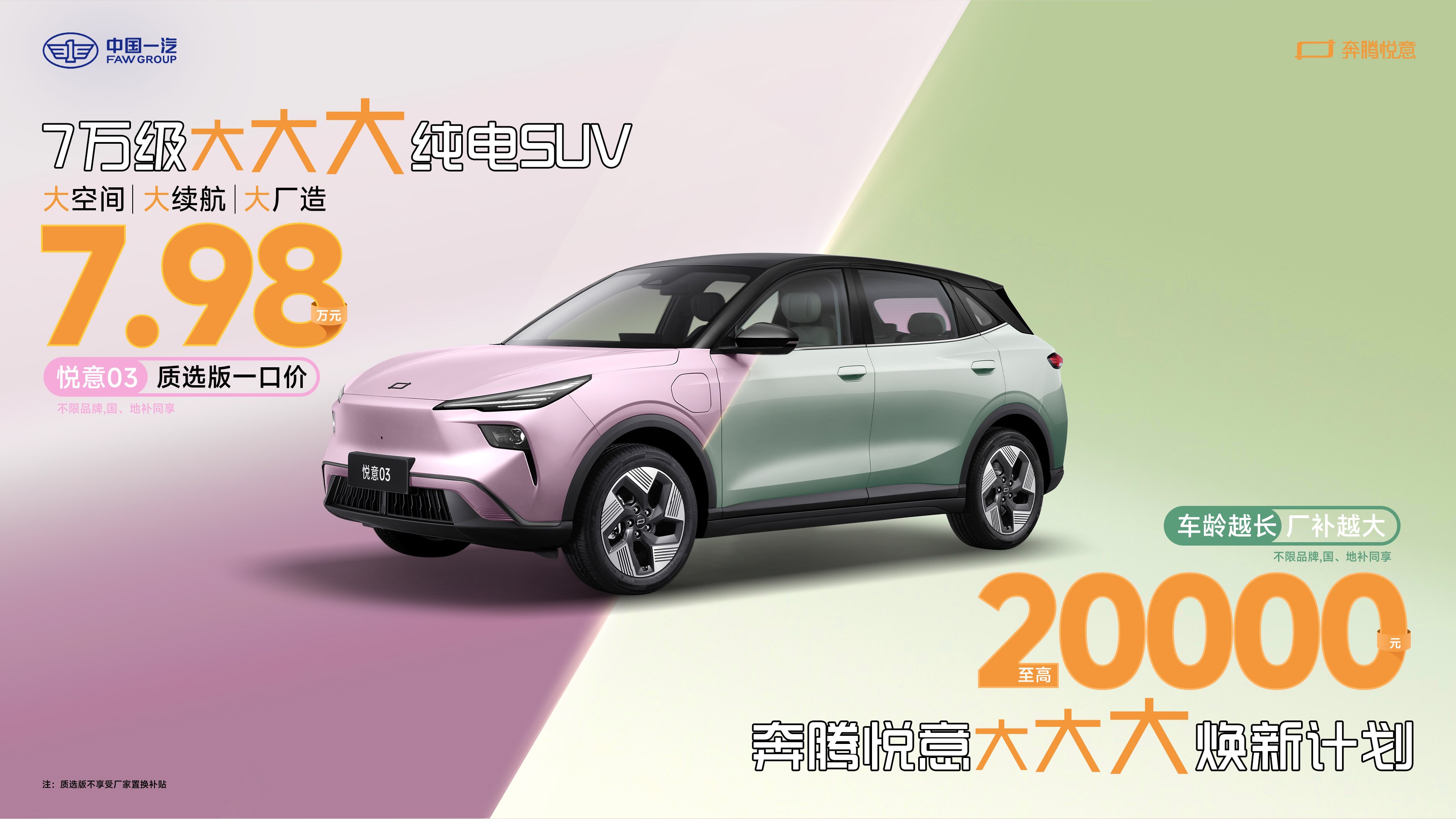 令人驚喜的是,剛剛上市的悅意03,即日起重磅加推全新版型“質(zhì)選版”,一口價(jià)僅售7.98萬(wàn)元,原有車(chē)型的煥新廠補(bǔ)還將拉高至最高20000元,同時(shí)還可同享國(guó)、地補(bǔ),堪稱A級(jí)SUV質(zhì)價(jià)比新卷王。再加持大空間、大續(xù)航和大廠造三大越級(jí)亮點(diǎn),悅意03這一“7萬(wàn)級(jí)大大大純電SUV”,必將成為奔騰悅意展臺(tái)的又一亮點(diǎn)。