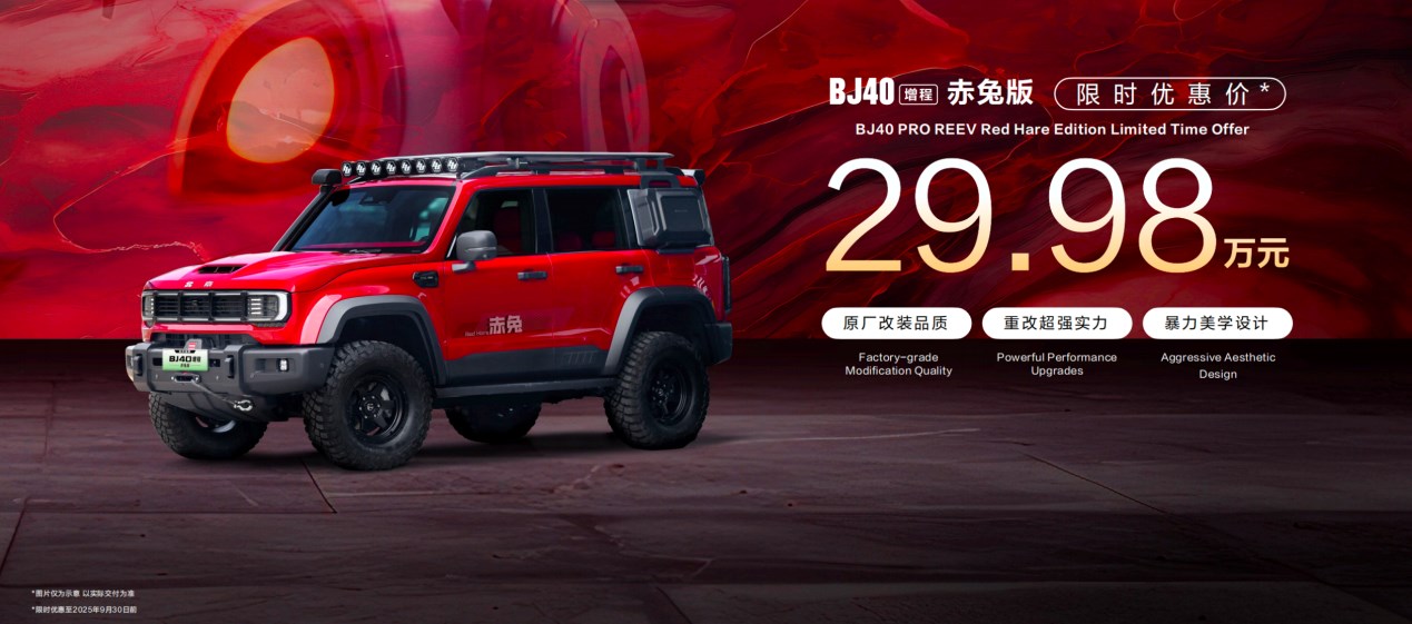 上市以來,BJ40增程進(jìn)階版訂單比例超過75%。北京越野董事長王昊宣布,BJ40增程赤兔版正式發(fā)布,實(shí)現(xiàn)顏值、性能、安全三大升級,大幅提升整車視覺沖擊力、越野性能以及安全防護(hù),改裝提升項(xiàng)價(jià)值超20萬元,限時(shí)優(yōu)惠價(jià)為29.98萬元(截止至9月30日),即刻可在“悅野圈APP”下單預(yù)存2000元創(chuàng)始基金,預(yù)計(jì)今年四季度正式交付。