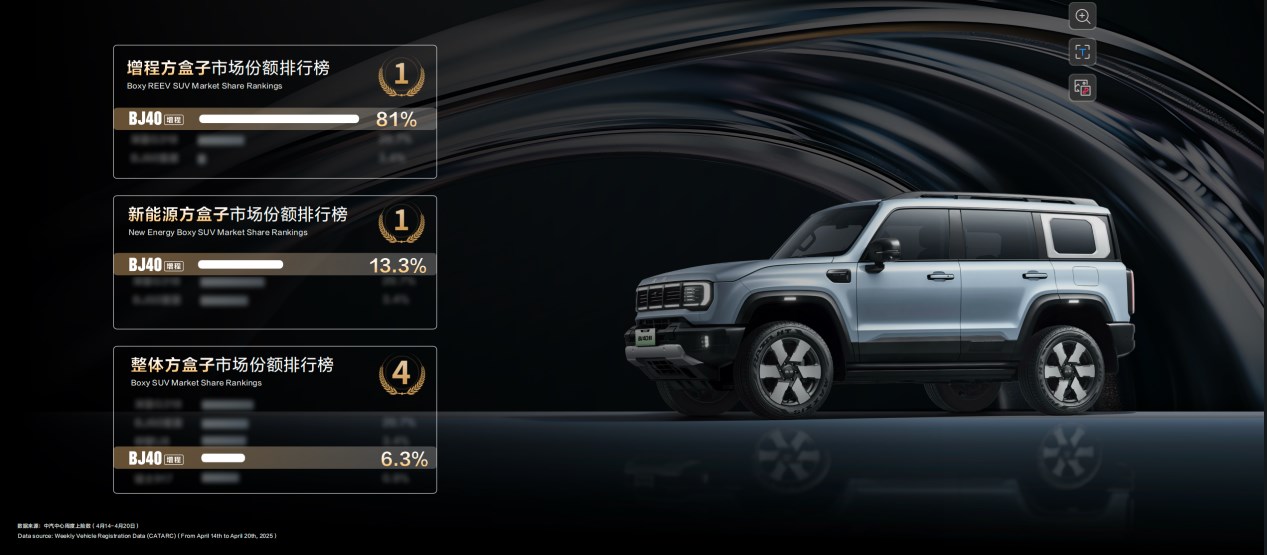 BJ40增程既能城市通勤非常省油、又能周末戶外肆意馳騁,發(fā)布會后1小時(shí)訂單量就突破了3000臺,48小時(shí)突破了1萬臺。根據(jù)中汽中心周度上險(xiǎn)數(shù)顯示,在增程方盒子排行榜上,BJ40增程上周市場份額達(dá)到81%;在新能源方盒子市場,排名第一;在整體方盒子市場中,排名第四。這是用戶對北京越野“做增程方盒子之王”的信任投票。