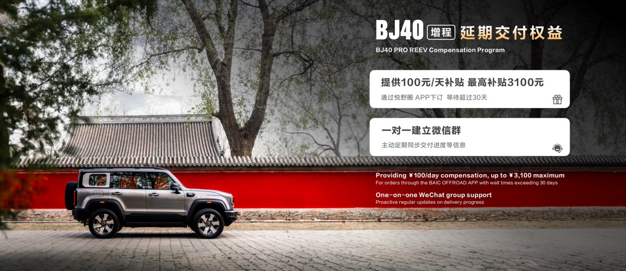 短時(shí)間大量訂單涌入,市場上存在部分車輛訂單延遲交付。北京越野發(fā)布“BJ40增程延期交付權(quán)益”,用戶在悅野圈 APP 下訂后,車輛等待時(shí)間超過 30 天后給予 100 元/天補(bǔ)貼,最高補(bǔ)貼 3100 元,補(bǔ)貼將在悅野圈 APP 以“積分”形式兌現(xiàn)給用戶。同時(shí),北京越野將與用戶一對一建立微信群,主動定期同步車輛生產(chǎn)下線進(jìn)度、物流發(fā)運(yùn)進(jìn)度及預(yù)計(jì)交車時(shí)間等,讓用戶的期待離實(shí)現(xiàn)越來越近。