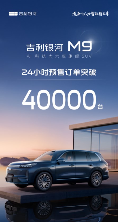 8月23日,吉利銀河旗下首款旗艦SUV吉利銀河M9開啟全球預(yù)售。次日,其預(yù)售訂單突破40000臺(tái),成為吉利銀河又一現(xiàn)象級(jí)爆款車型,印證“人民的M9”超強(qiáng)國民認(rèn)可度。