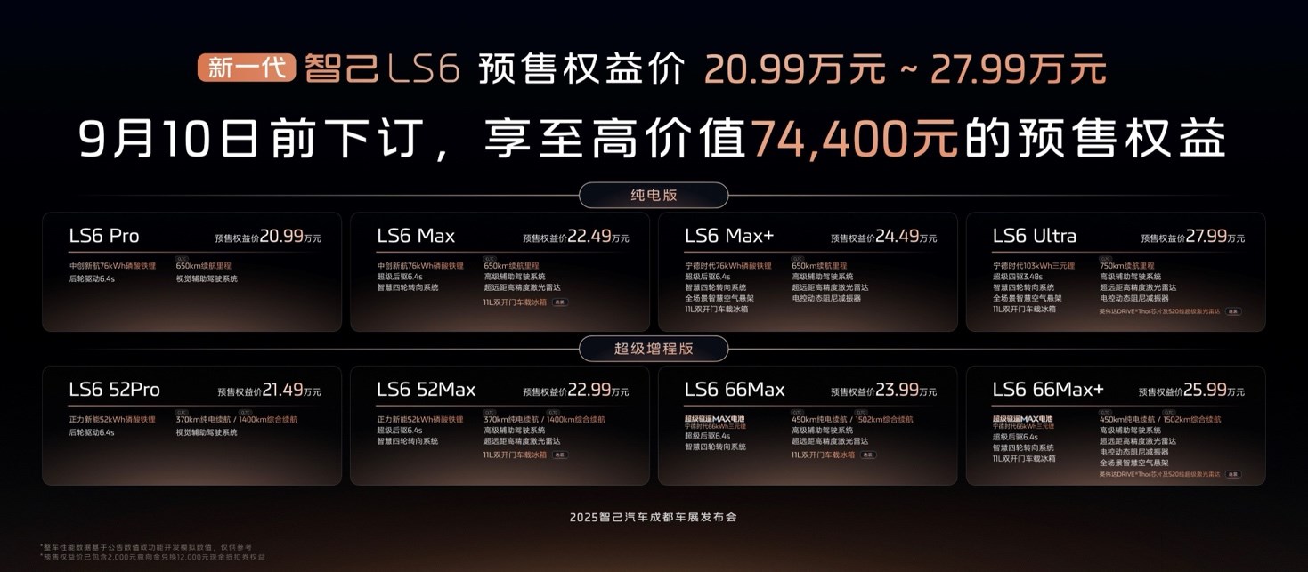 新一代智己LS6預(yù)售權(quán)益價(jià)格區(qū)間為20.99萬(wàn)元~27.99萬(wàn)元。自8月15日開啟預(yù)售以來(lái),迅速引爆市場(chǎng),全國(guó)門店客流與訂單量雙雙大幅攀升。截至目前,預(yù)售訂單已突破48,000臺(tái)。為回應(yīng)用戶熱情,智己汽車在成都車展上官宣,再度重磅加碼預(yù)售權(quán)益,疊加16,000元的“舒享套裝”后,預(yù)售權(quán)益總價(jià)值至高74,400元,以前所未有的滿滿誠(chéng)意,讓這個(gè)時(shí)代前沿的智能出行體驗(yàn)人人可享,進(jìn)一步夯實(shí)“20萬(wàn)級(jí)大五座智能SUV首選”的標(biāo)桿地位。