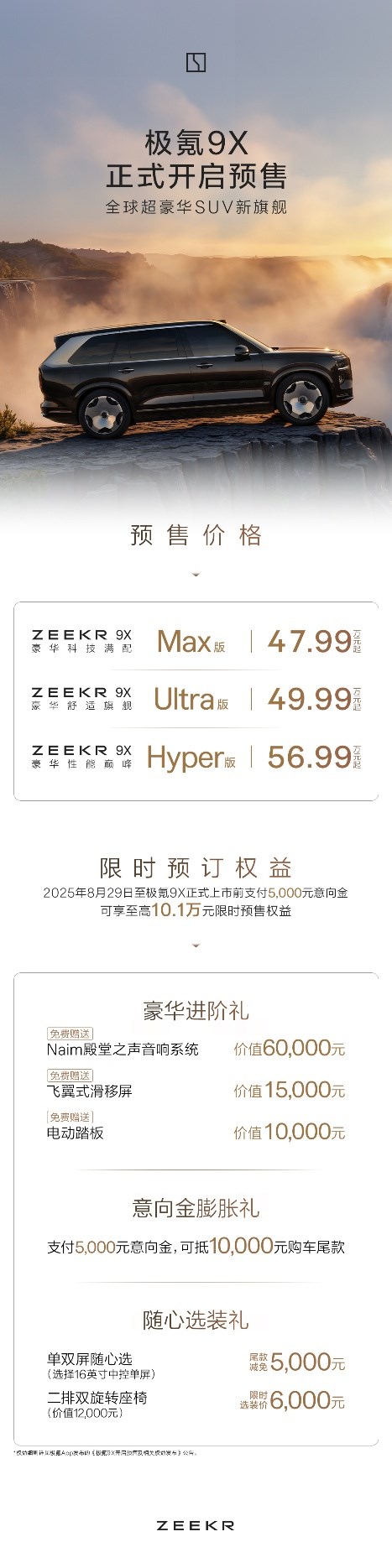限時(shí)預(yù)訂權(quán)益:2025年8月29日至極氪9X正式上市前支付5,000元意向金,可享至高10.1萬元限時(shí)預(yù)售權(quán)益,包括免費(fèi)贈(zèng)送Naim殿堂之聲音響系統(tǒng)、飛翼式滑移屏和電動(dòng)踏板在內(nèi)的豪華進(jìn)階禮,支付5,000元意向金可抵10,000元購車尾款,以及包括單雙屏和二排雙旋轉(zhuǎn)座椅在內(nèi)的隨心選裝禮。