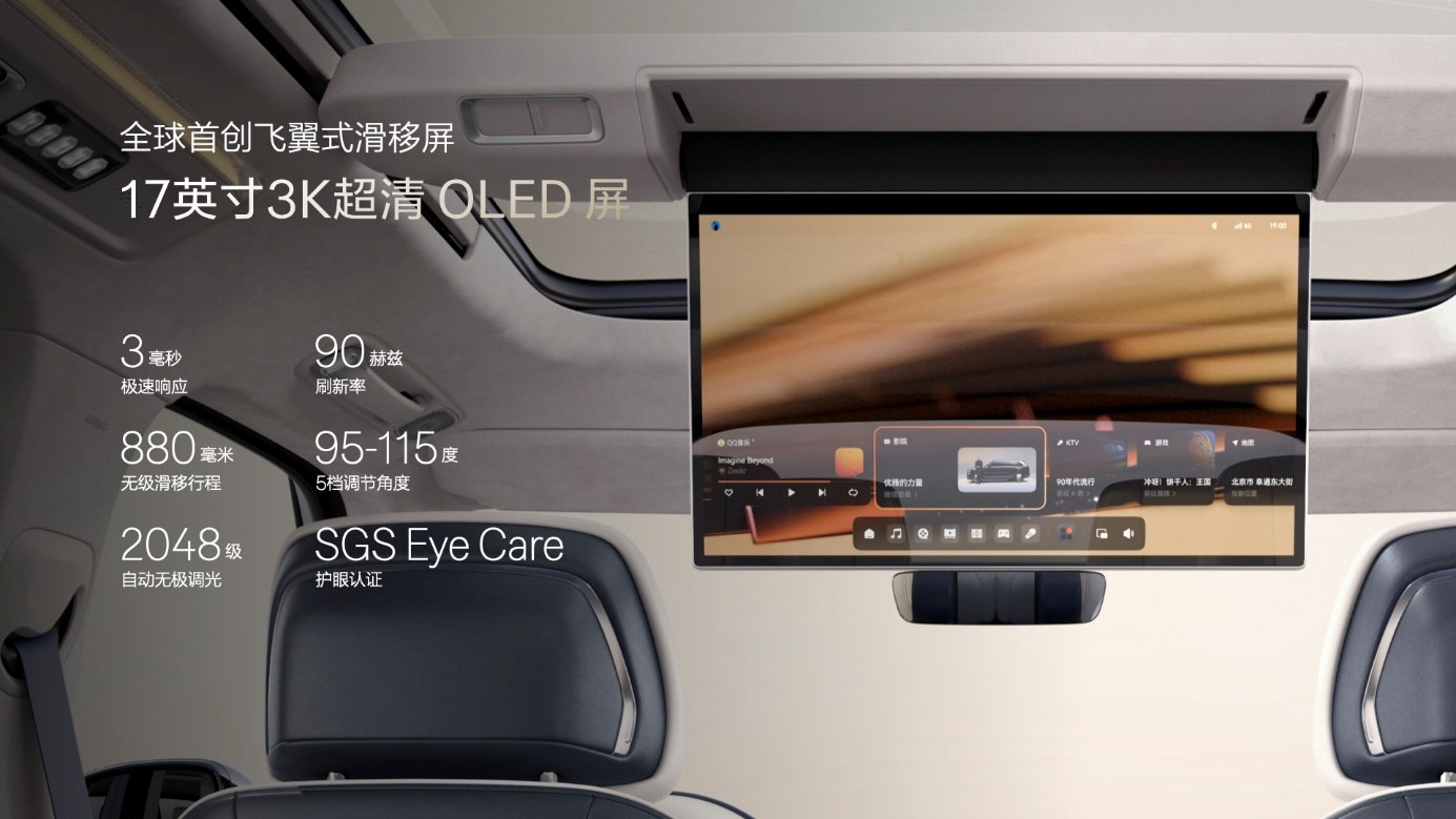 極氪9X還搭載全球首創(chuàng)的17英寸3K超清OLED飛翼式滑移屏,徹底解決后排吸頂屏與天窗開啟的沖突。通過車頂高強(qiáng)度滑軌結(jié)構(gòu),飛翼式滑移屏可實(shí)現(xiàn)88厘米無極滑移與5檔角度調(diào)節(jié),無論乘客落座哪一排、以何種坐姿,屏幕都能“飛”至面前,隨時(shí)呈現(xiàn)大千世界的無限精彩,用遠(yuǎn)見讓掌控千里視野成為現(xiàn)實(shí)。